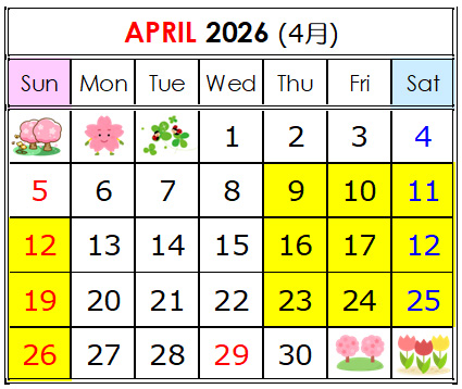 ※黄色の日がレッスン日です。